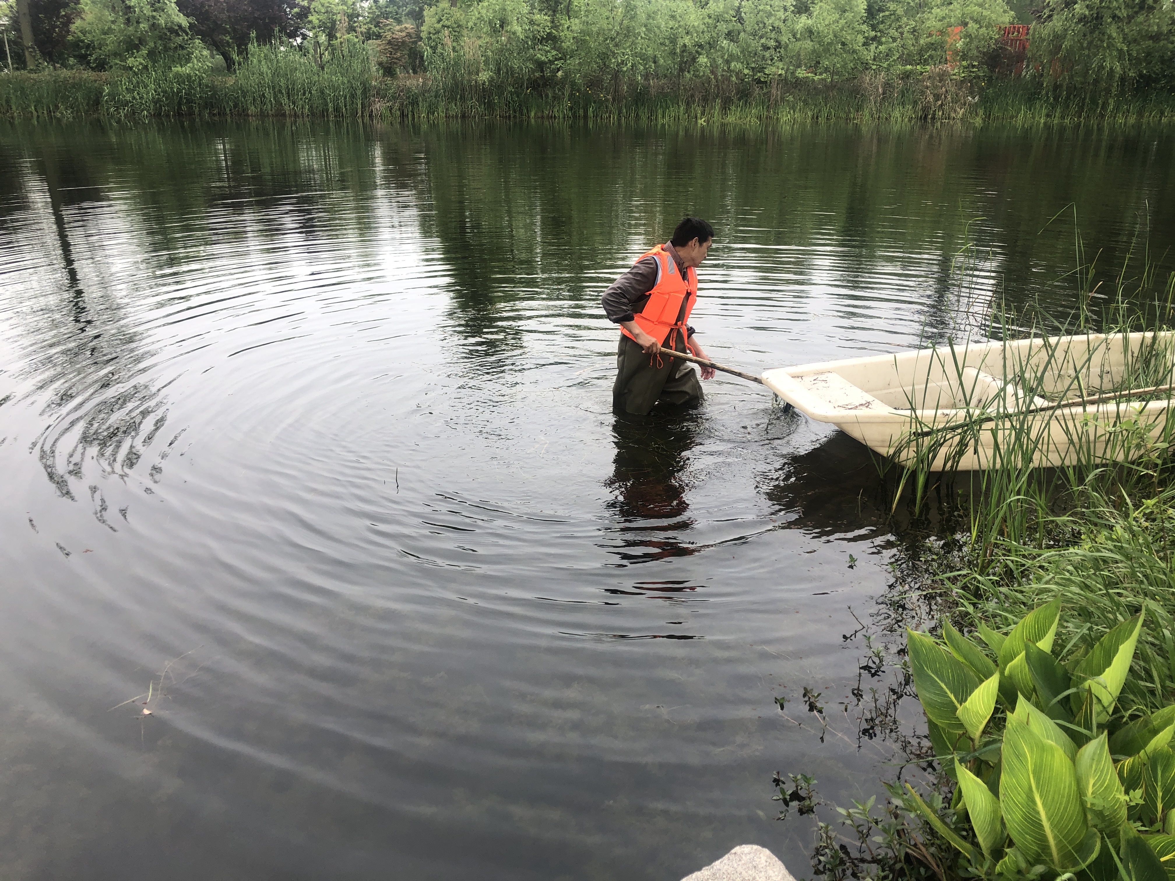圖:武漢華僑城項(xiàng)目運(yùn)維清理湖面浮渣